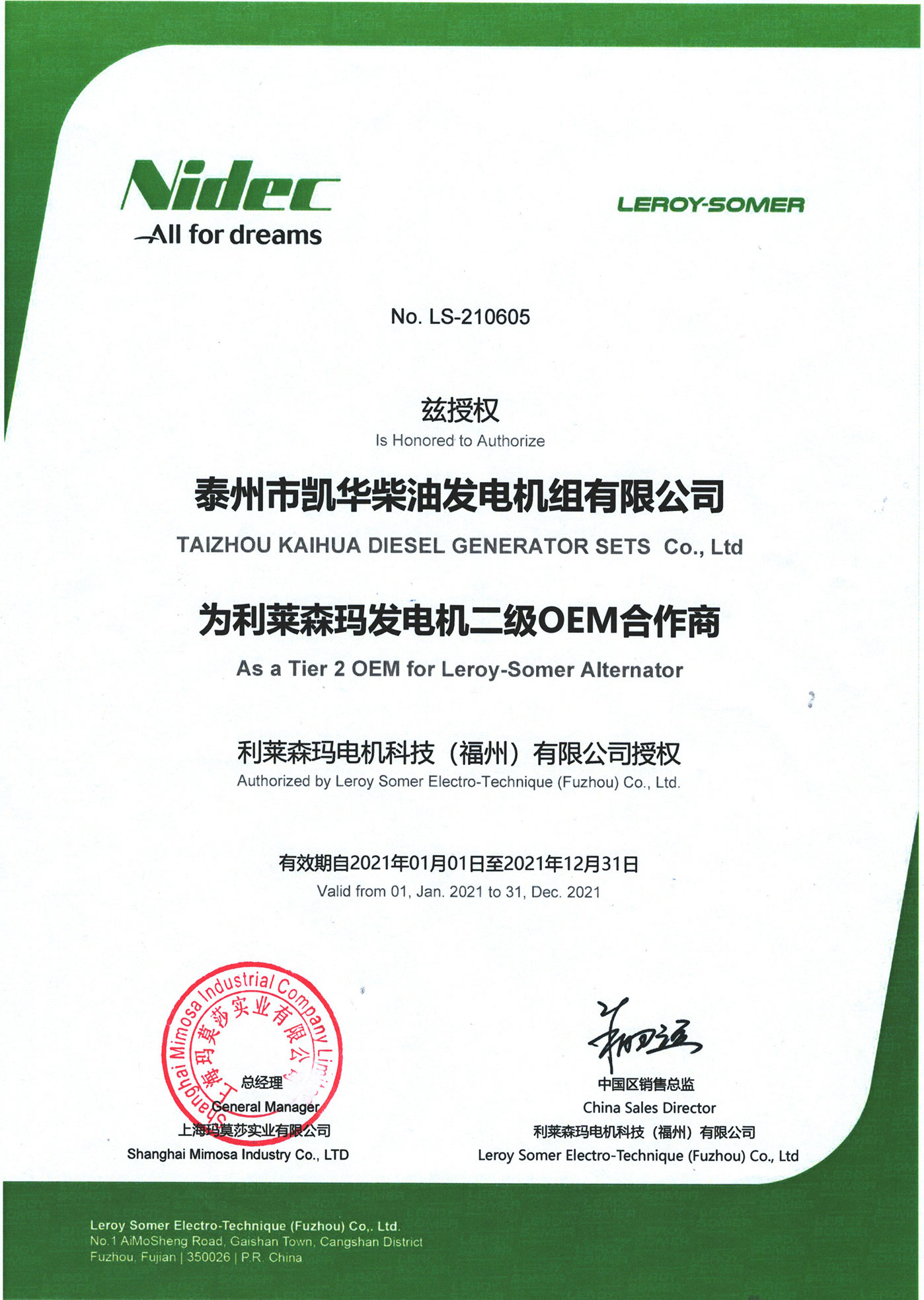 泰州市凱華柴油發(fā)電機(jī)組有限公司創(chuàng)建于2003年,是一家集柴油發(fā)電機(jī)組燃?xì)獍l(fā)電機(jī)組的研發(fā)、生產(chǎn)、銷售為一體的高新技術(shù)民營企業(yè),公司座落于“漢唐古郡,淮海名區(qū)”,具有“鳳凰城”美稱的祥泰之州——江蘇省泰州市,地處中國經(jīng)濟(jì)最發(fā)達(dá)的長三角經(jīng)濟(jì)圈,水陸空立體交通,地理位置十分優(yōu)越。公司目前注冊資本金11800萬元人民幣,生產(chǎn)基地占地六十畝,現(xiàn)有各類高素質(zhì)員工一百多名,專業(yè)技術(shù)人員達(dá)46人,其中高級技術(shù)人員16人,年銷售額近6億元。 公司主營產(chǎn)品:3~3000KW陸用柴油發(fā)電機(jī)組,15~600KW移動(dòng)拖車電站,12~1000KW船用應(yīng)急柴油發(fā)電機(jī)組,各種靜音型、中高壓、多機(jī)并聯(lián)、燃?xì)獾忍胤N機(jī)組以及進(jìn)口系列柴油發(fā)電機(jī)組,可滿足不同客戶的一切電力需求,還可滿足用戶不同電壓、不同頻率的要求。凱華公司是康明斯品牌的授權(quán)代理商,專業(yè)生產(chǎn)供應(yīng)康明斯柴油發(fā)電機(jī)組。